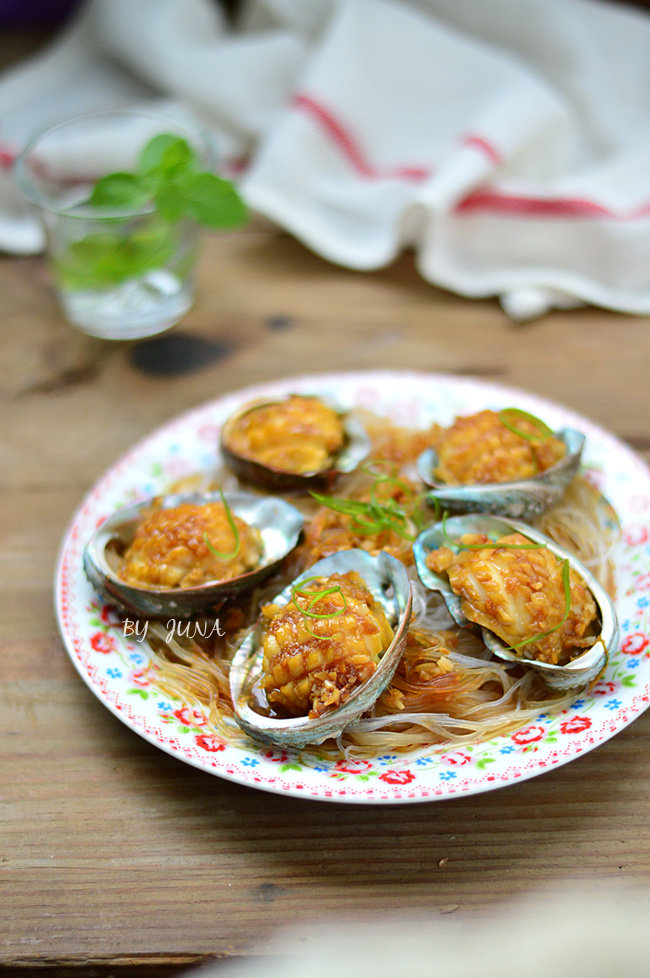5:将鲍鱼放在粉丝上,全部弄好后将蒜泥和蒸鱼豉油浇在鲍鱼上,蒸7、8分钟即可。