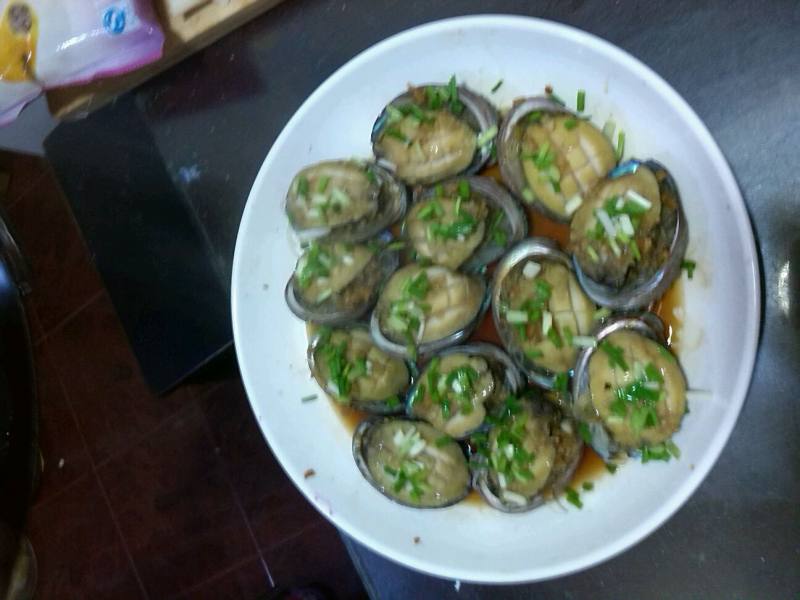 11:水烧开后放进去蒸,记得大火蒸6分钟即可,然后用葱用油爆香再淋在小鲍鱼身上