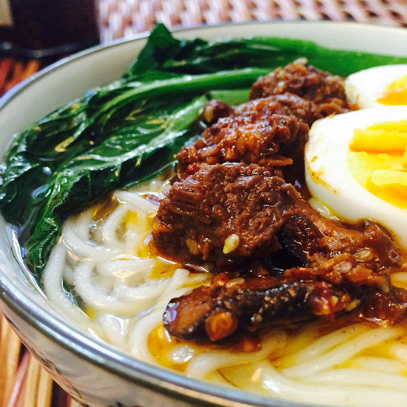 7:起锅,在碗里加入牛肉酱。如果没有牛肉酱也可以加入其他酱料,老干妈也行,喜欢就好。
