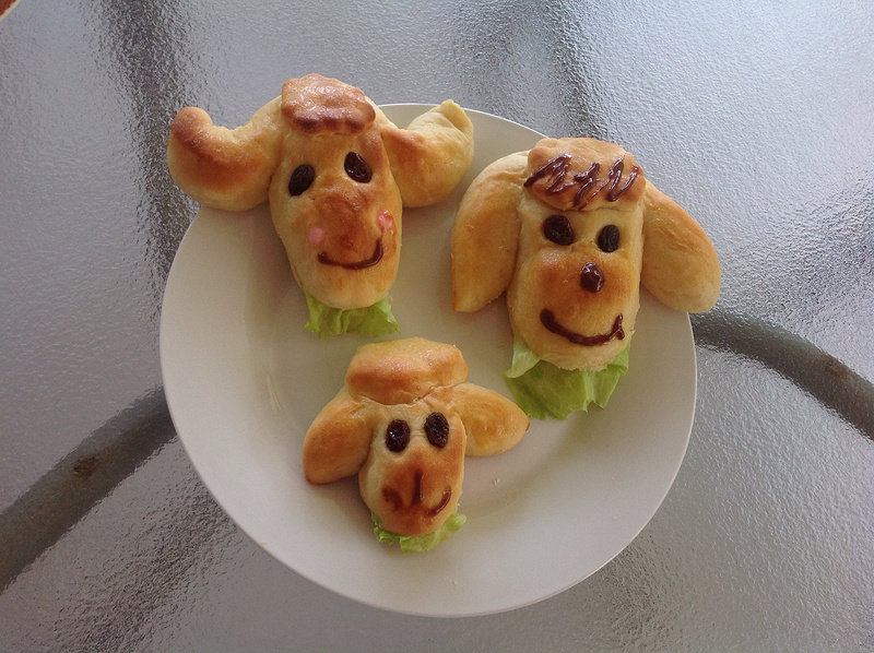 改变面团椭圆的形状和耳朵的位置,你还轻易可以做出其他可爱的动物,如狗或熊之类的。在狗狗嘴里塞上一根火腿肠,那模样才叫cute呢!如果准备做汉堡胚的,可减少糖的用量,减至三十克就够了。