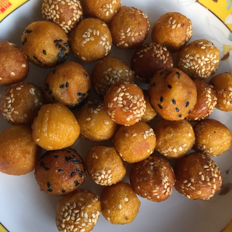 11:再次揉下(为把芝麻嵌进地瓜丸里,炸时免得掉芝麻)