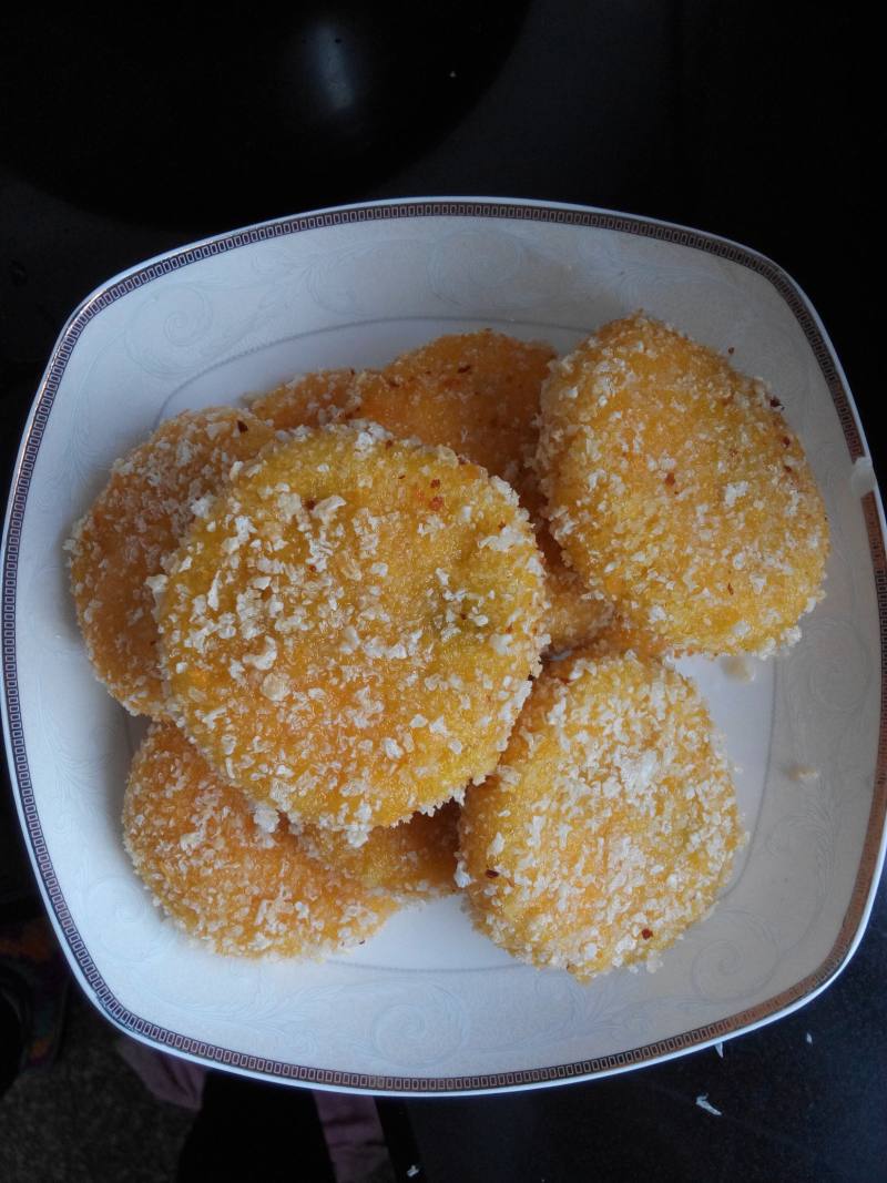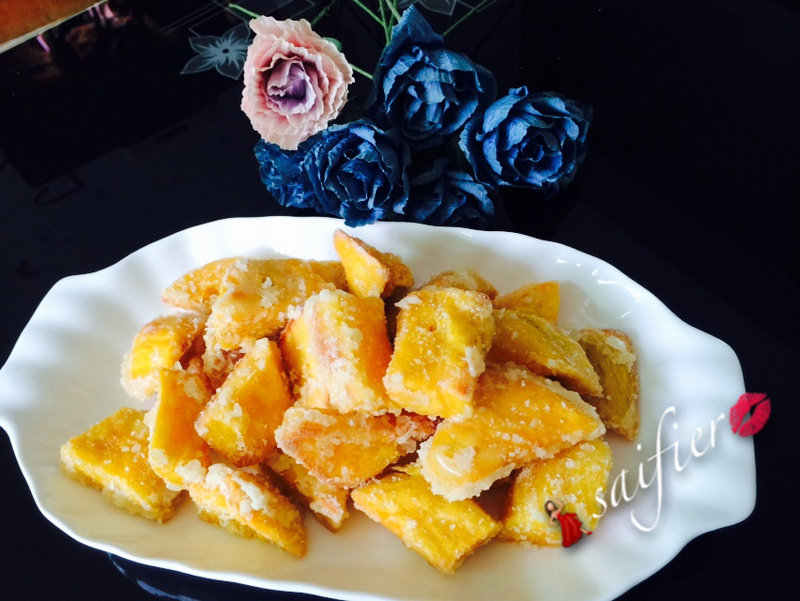 南瓜500g;豆沙馅300g;面包糠适量;糯米粉700g;