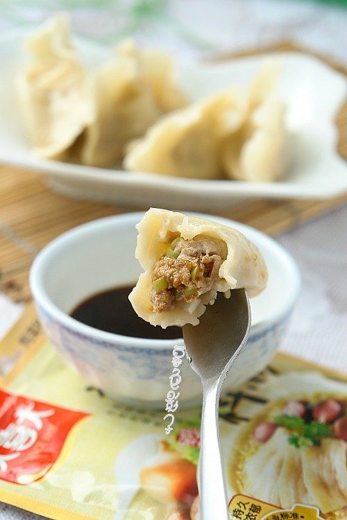 7:饺子皮是事先买好的,把和好的肉馅放入饺子皮,对折捏紧或用包饺子器包好。