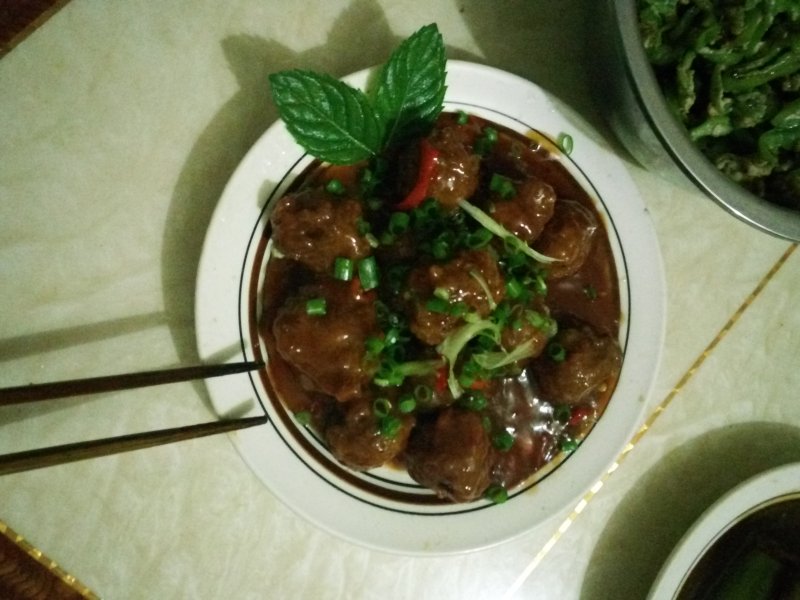 11:最后放入盐和味精调味均匀使每个肉丸均匀的裹上料汁即可出锅享用。