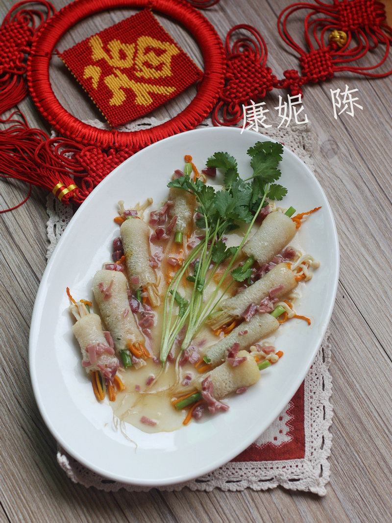 12:将金华火腿高汤浇在养生竹笙卷上面,撒上香菜就可以了。