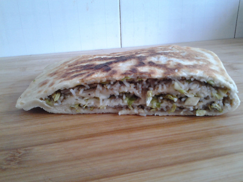 8:包好的菜盒放平底锅烙。火要小一点,中间盖锅盖,主要是让馅成熟。