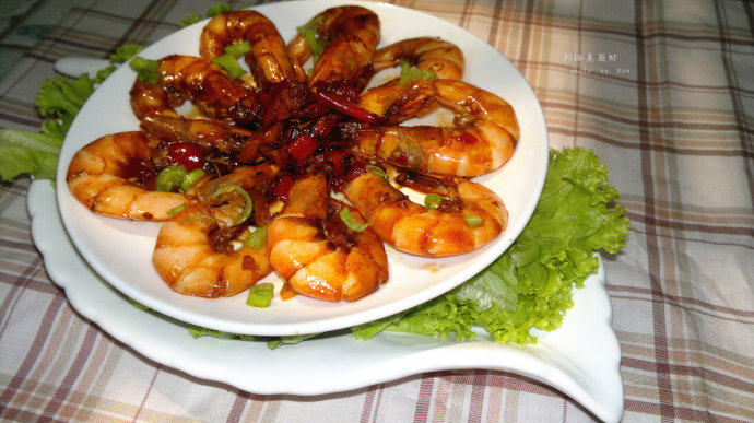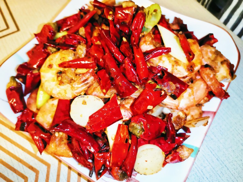 3:锅中放油,姜,蒜,葱切成小段花椒,放入锅中煸炒,加入干辣椒,炒一分钟放入炸好的虾,大火翻炒均匀,放入调料盐,鸡精,白糖均匀翻炒即可出锅。
