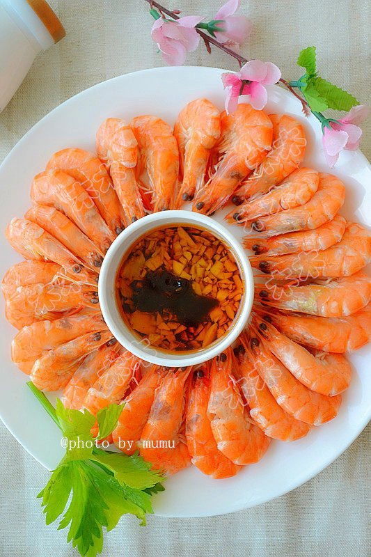 6:捞出看虾全部变红就可以了,上桌时用小碟子盛上醋和生抽,滴几滴香油,沾汁吃更美味。