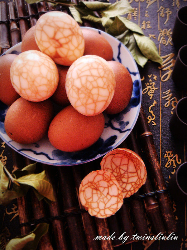 4:放生抽1/4杯、盐2茶匙和糖1茶匙入锅,搅拌几下,放鸡蛋改中火把水烧开,关火,让鸡蛋泡在汤里就可以了,汤汁会从鸡蛋的裂缝里渗入,从而产生裂纹,鸡蛋也会有些味道了。