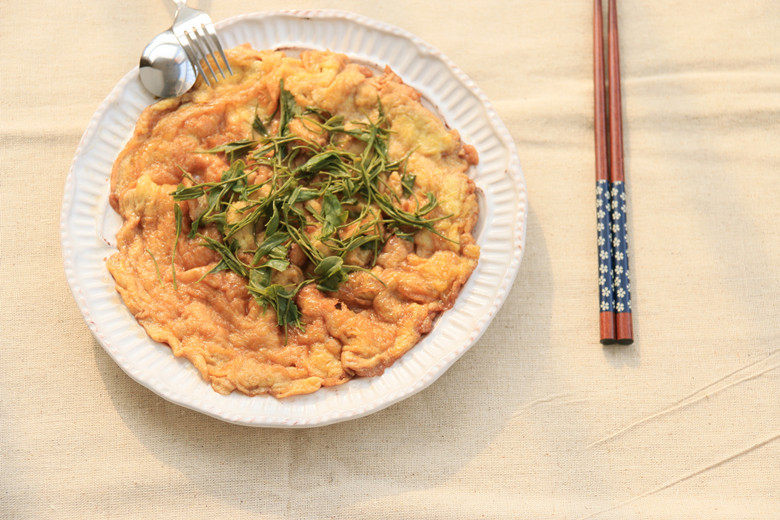 4:鸡蛋饼成型后,轻轻晃动几下,以免粘锅,然后翻面,倒入大约50克左右的茶叶水。