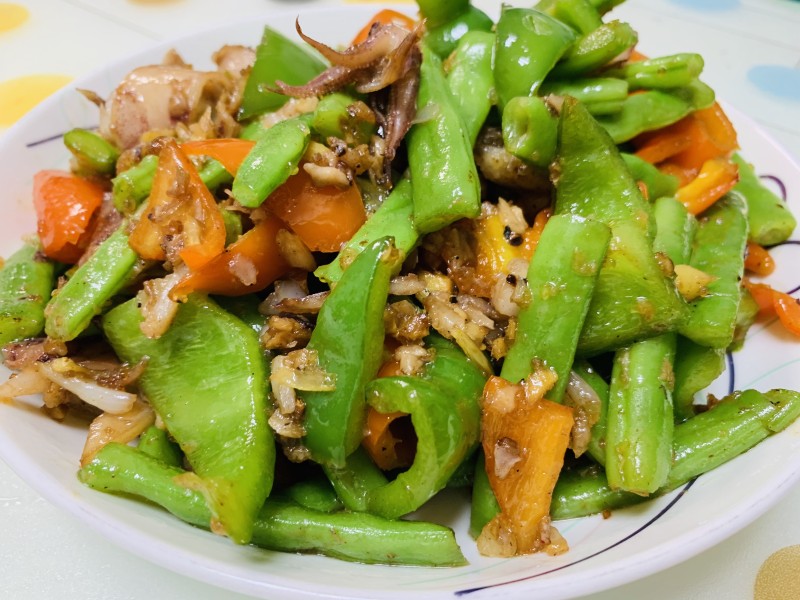 墨鱼仔4只;豆角350g;红尖椒1个;甜椒1个;