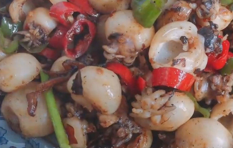 6:锅烧热放少许油,倒入葱姜蒜、麻椒和辣椒加少许盐爆香,再倒入墨鱼仔,大火翻炒一下即可。