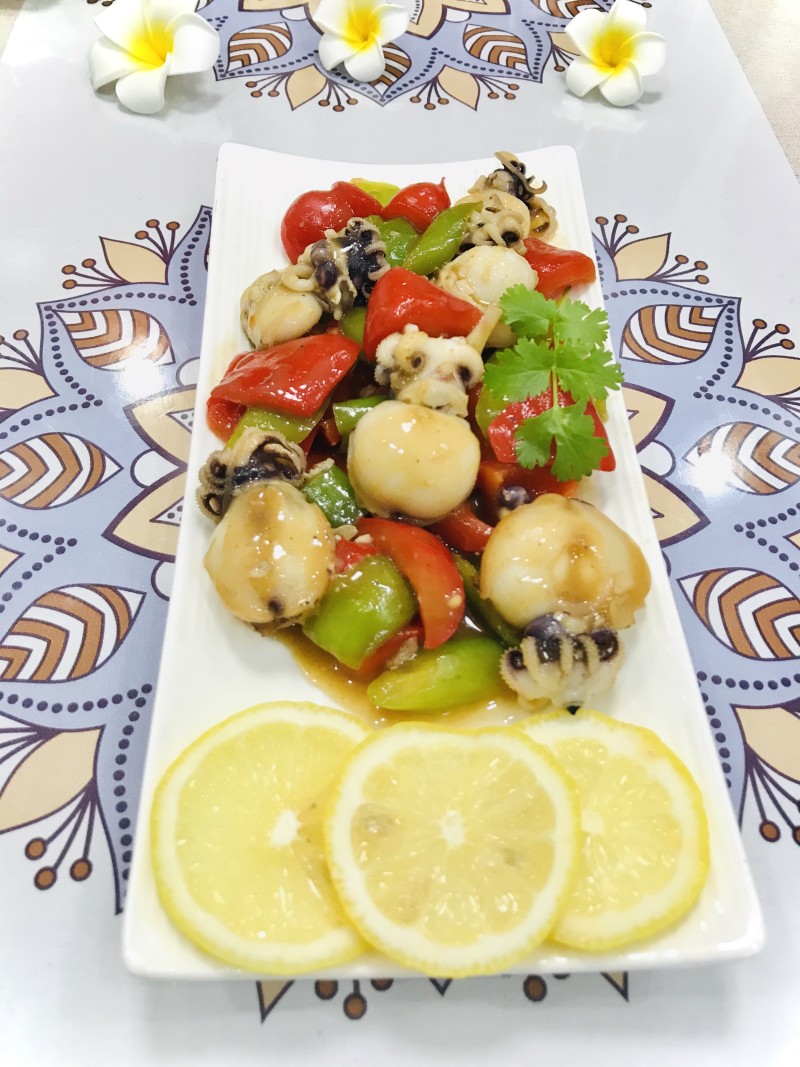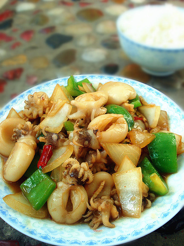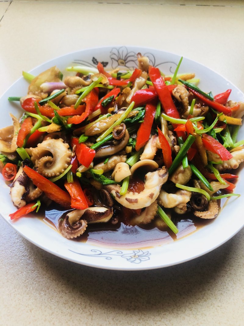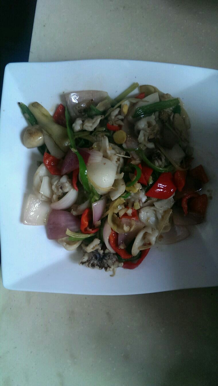 1:墨鱼仔,我用的是煮熟的,快炒。尖椒甜椒都洗干净。