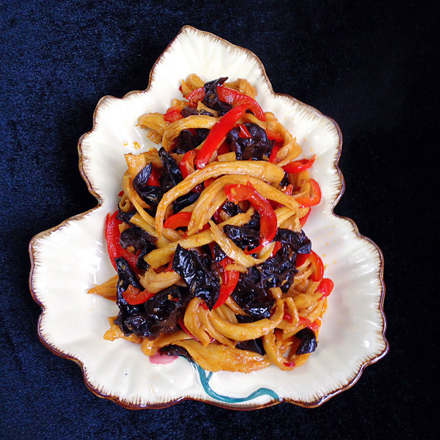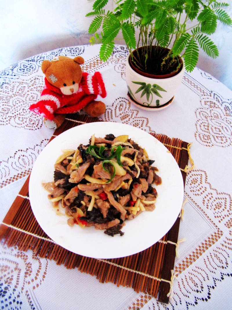 10:下入木耳丝、冬笋丝大火快速煸炒。