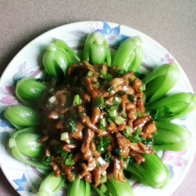 瘦肉250克;上海青250克;葱50克;白糖20克;陈醋20克;淀粉10克;盐适量;