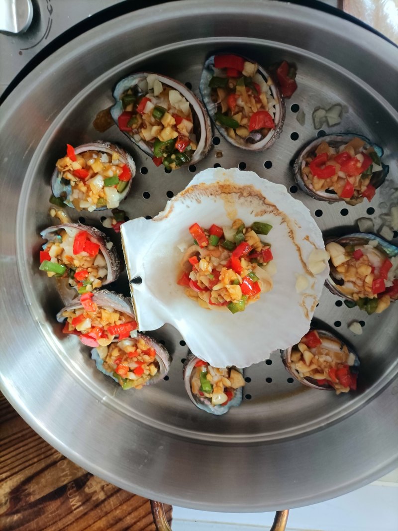 6:把切好的鲍鱼摆放在清洗干净的鲍鱼壳中,蒸锅加入水烧开后,把鲍鱼放在里面蒸10分钟。