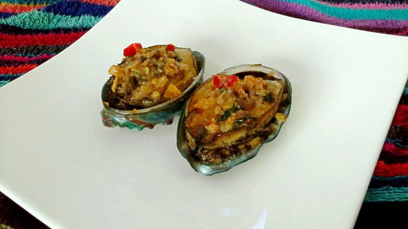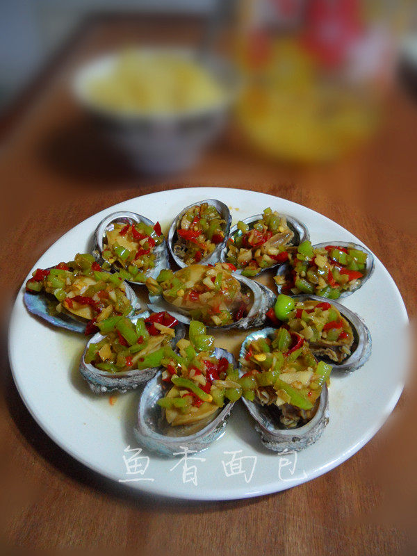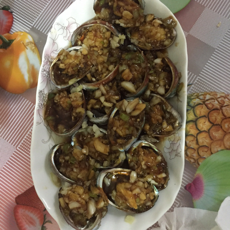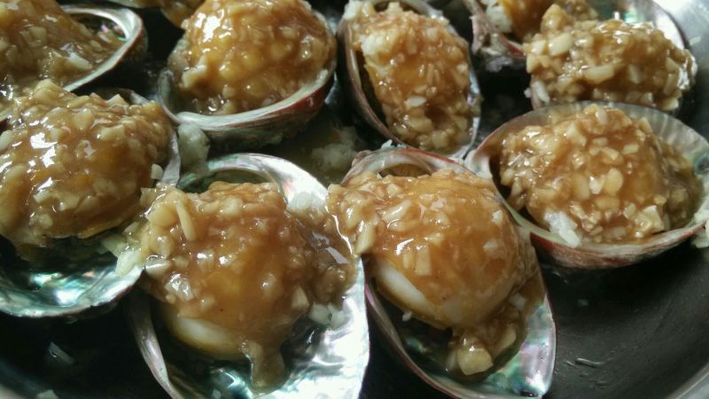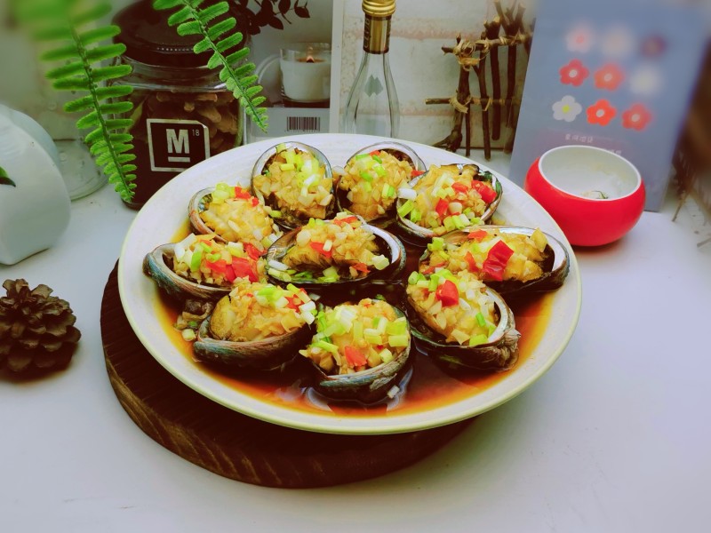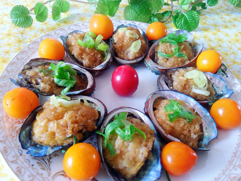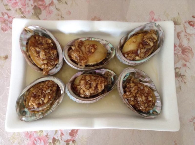 11:用勺子往每个鲍鱼勺一勺蒜蓉,就可以上桌。