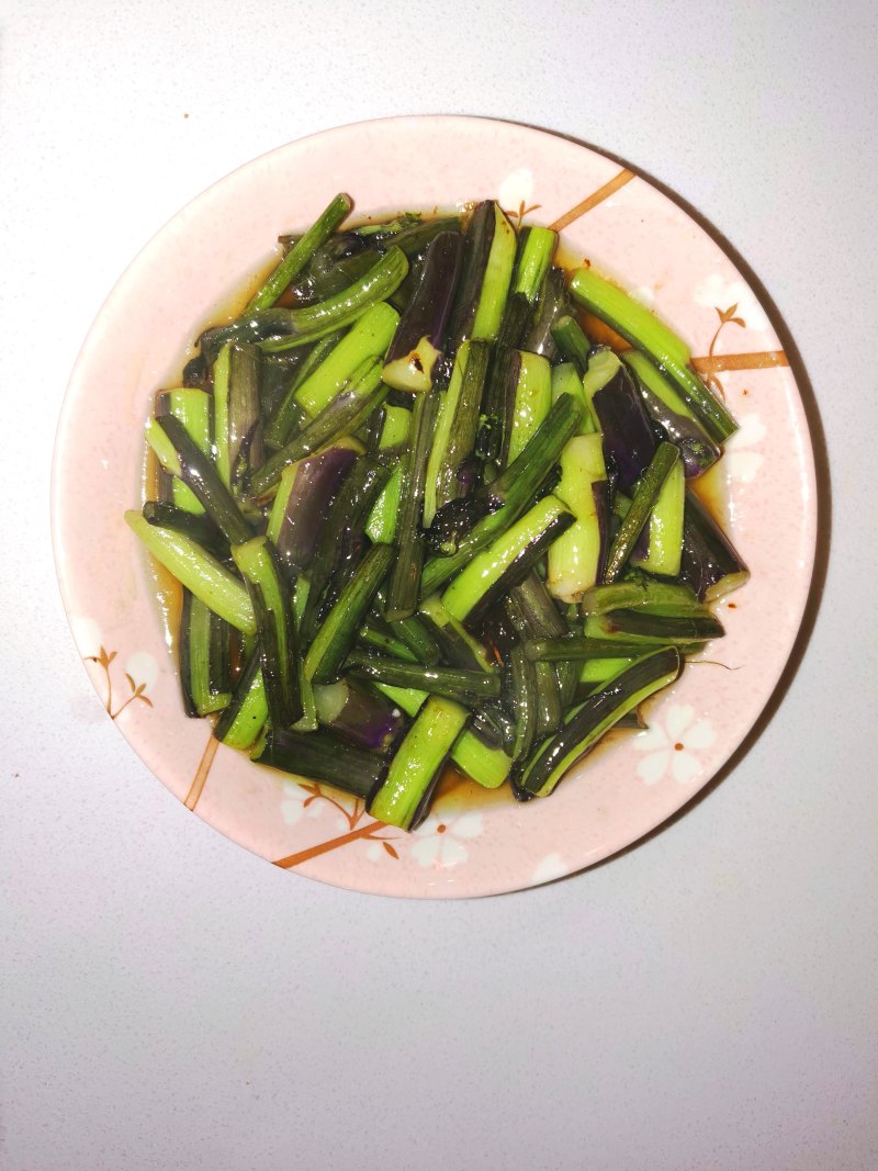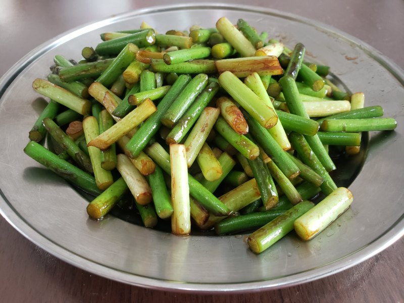 4:锅烧热放少许油,倒入蒜苔,翻炒几下,加盐、生抽和鸡精调味,拌匀即可。