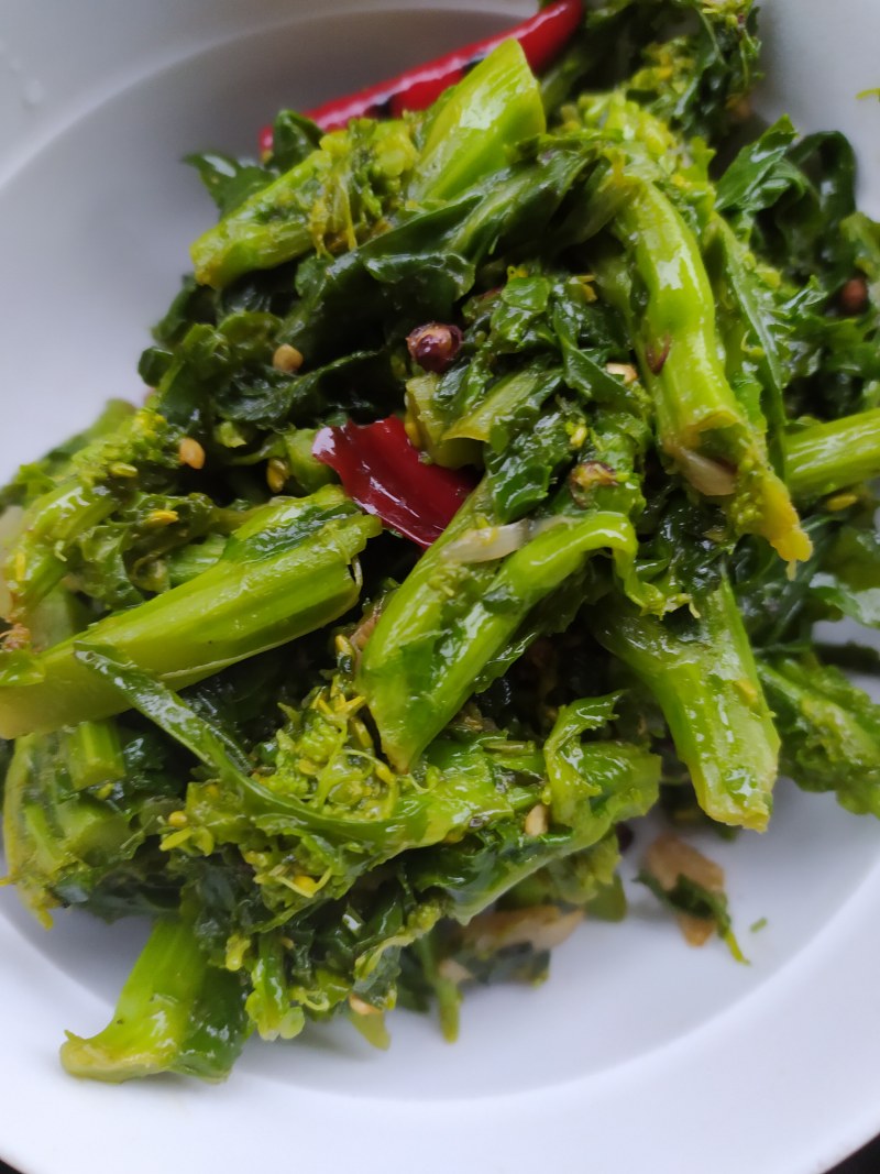 2:锅中放葱花椒油炒菜苔至断生,放盐炒匀