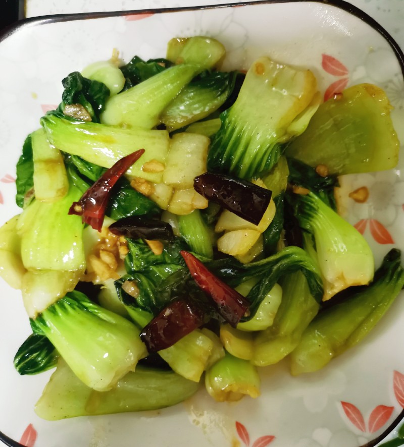 3:热锅上油,油烧开后加入准备好的花椒辣椒,放入油菜和蒜不断翻炒。