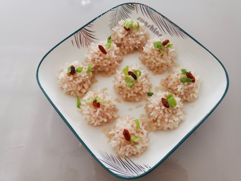 7:将肉馅团成丸子,均匀的裹上糯米,放入盘中,胡萝卜切碎,洒在丸子上