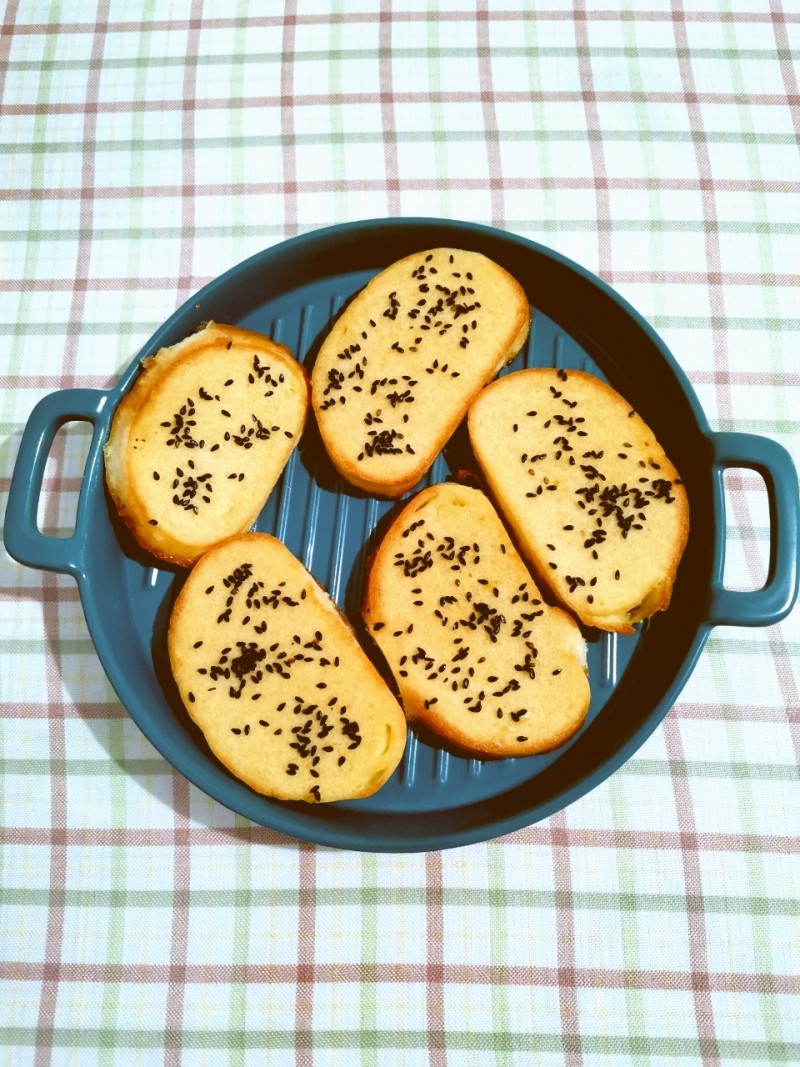 4:烤盘刷油,馍片一次沾上调好的料,撒上黑芝麻