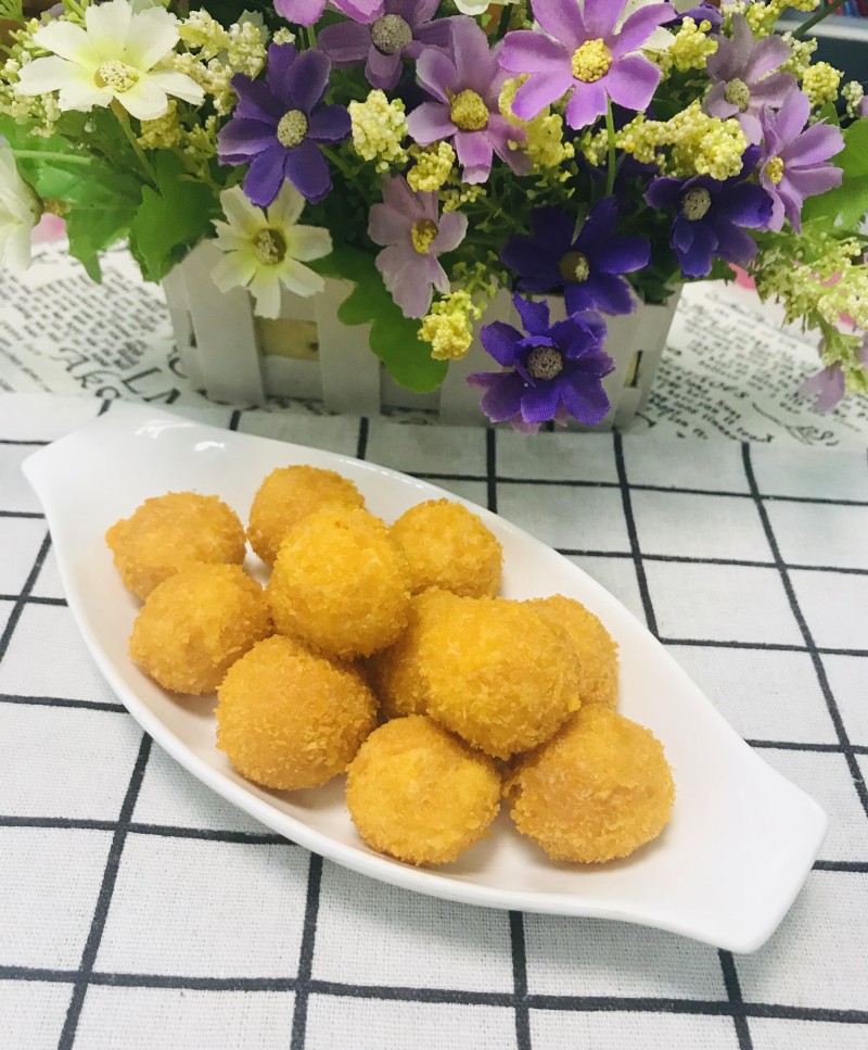 5:用勺子勺一勺薯泥,用手搓圆,先滚一圈面粉,再放入鸡蛋液,最后放面包糠滚一圈,放盘子静止一会。