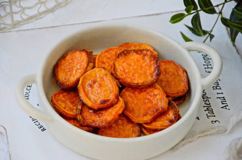 2:切成薄片,并不是越薄越好,薄如蝉翼的红薯片高温烘烤以后很容易变黑,味道发苦,大约3毫米的厚度比较合适。