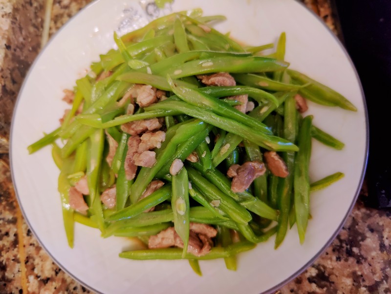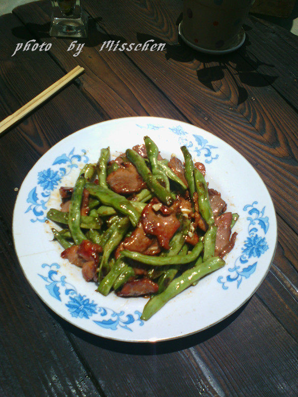 3:另起锅煎出油下瘦肉炒香,下蒜蓉、小辣椒翻炒出香味后下四季豆炒…炒至四季豆有些干煸后加入酱油、十三香翻炒两三分钟后加盐调味炒匀关火装盘。