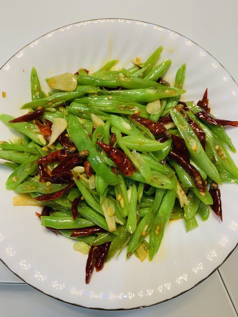 1:下干辣椒爆香出味,把四季豆放进去翻炒。
