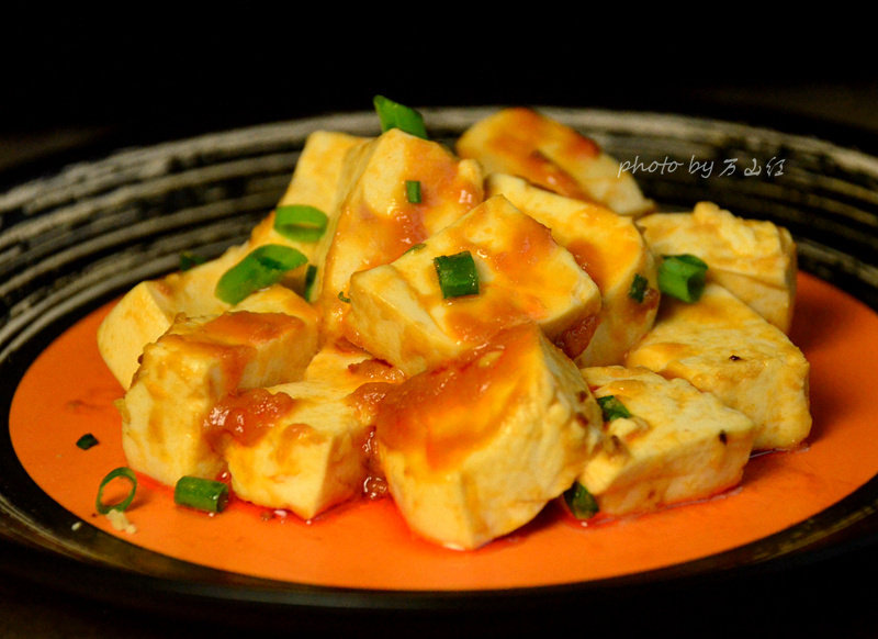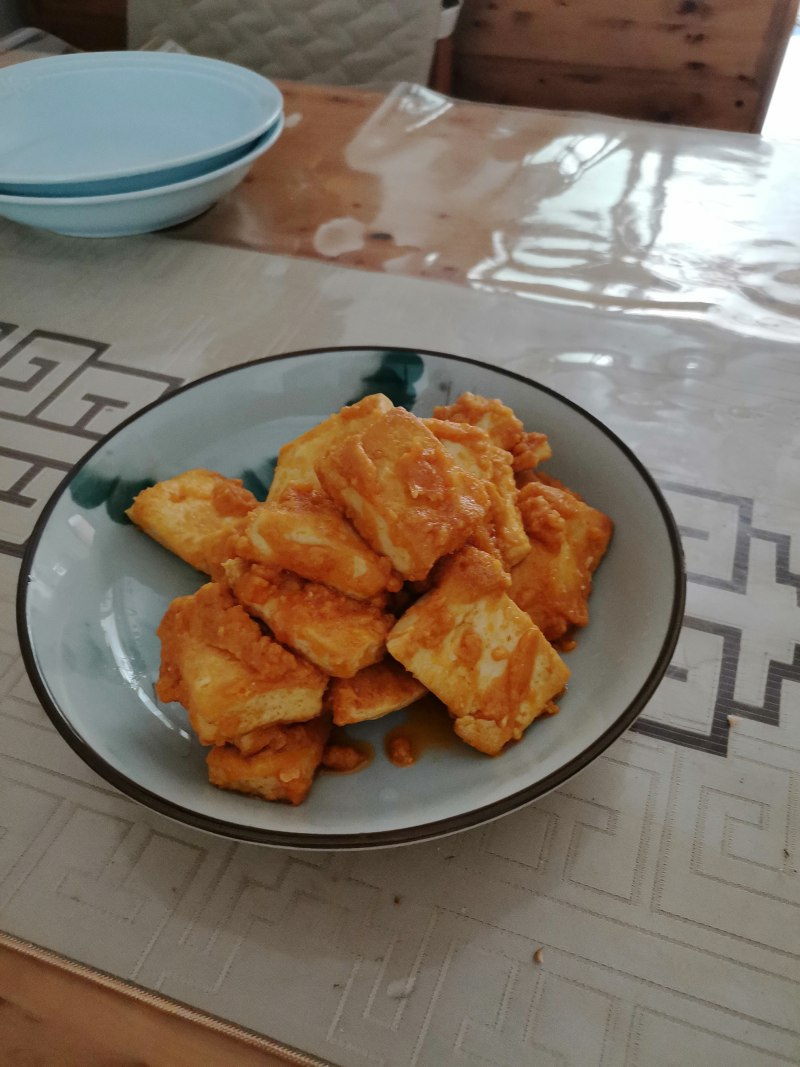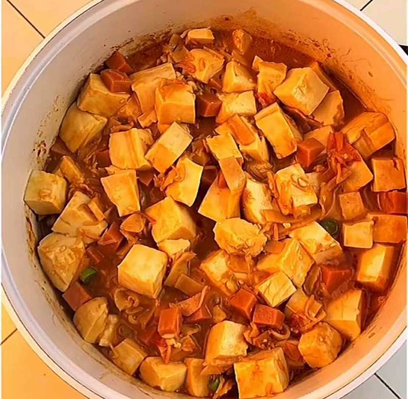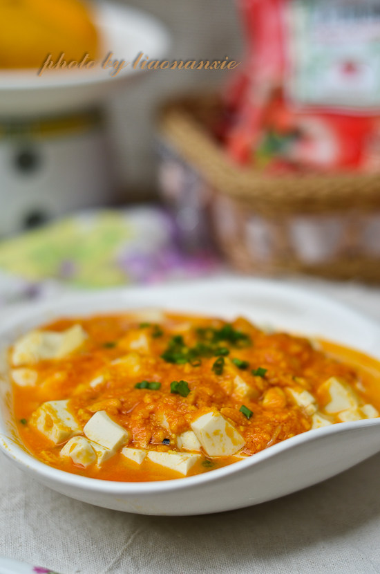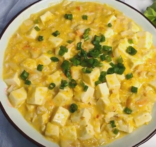 3:下入豆腐盖上锅盖焖五分钟,蟹黄焗豆腐就完成啦。