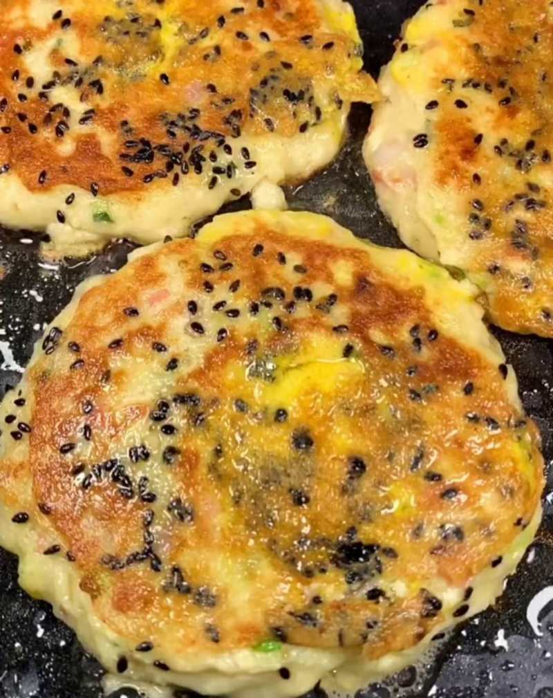 3:取适量面糊摊开下锅煎,中间拨开放入蛋黄,撒上芝麻煎熟,蛋黄豆腐就完成啦。