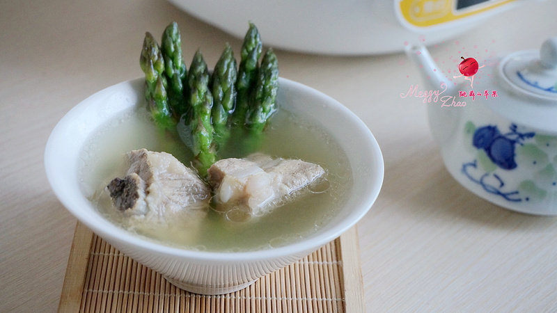 凉水煮排骨才能将其中的血水逼出来;焯水后的排骨一定要加入热水同煮,否则加凉水蛋白质会紧缩,肉变得干硬不好吃了;九阳电炖锅密封性能及火力很稳定,因此水量要根据食用量来增减;程序自带的“老火汤”程序4小时,可根据个人口感喜好提前终止;出锅前几分钟入芦笋,可保持芦笋的味道和营养不流失过多;盐建议出锅前加入或者入个人碗中,以防摄入过多的食盐。