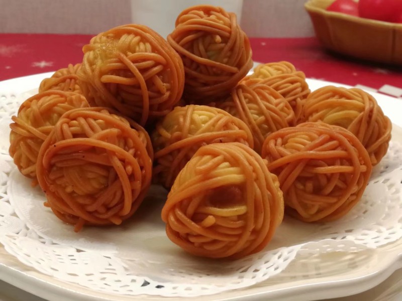 3:把面条绕在鹌鹑蛋上。