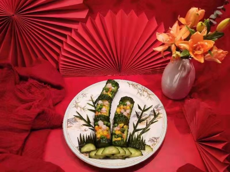 黄瓜2个;虾仁适量;青豆适量;甜玉米粒适量;胡萝卜1段;