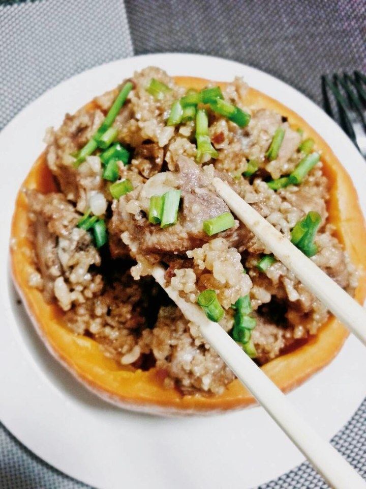 3:搅拌均匀后放在铺平的南瓜上,放入电饭煲跟米饭一起蒸,期间你就可以去梳洗打扮啦。