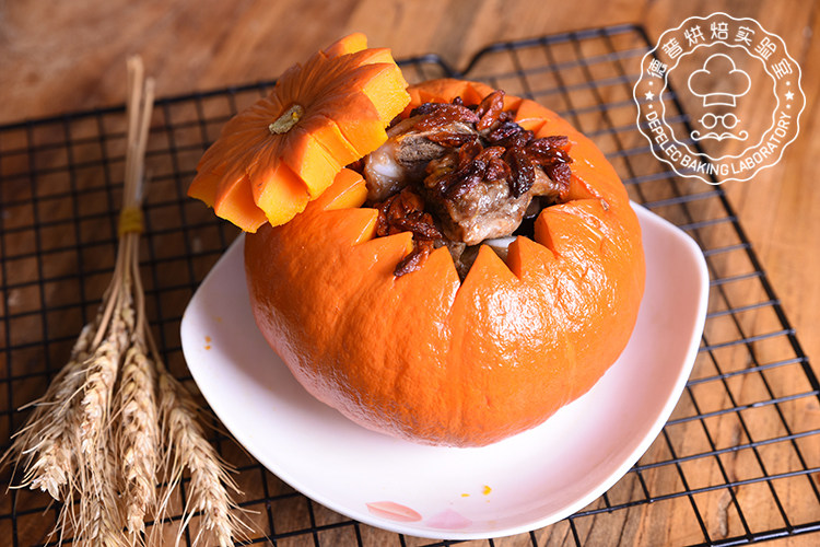 3:腌制好的排骨放入南瓜盅,盖上盖子
