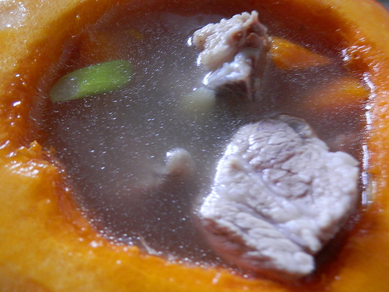 6:高汤入锅开火,依次放入葱、姜、南瓜、排骨一起煮2分钟,盛入南瓜里