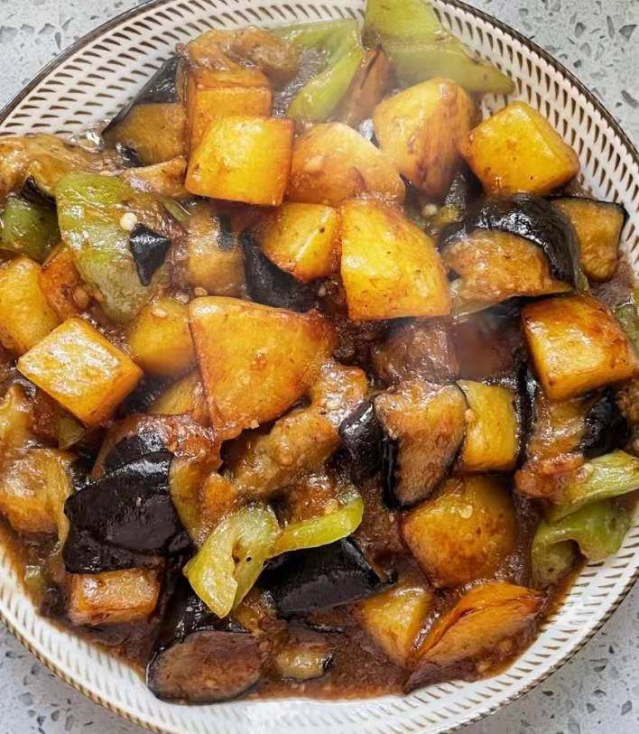 1:土豆洗净去皮,和青椒、茄子一起切滚刀块。茄子入150°油温,炸至金黄,捞出沥净水分备用
