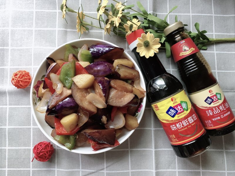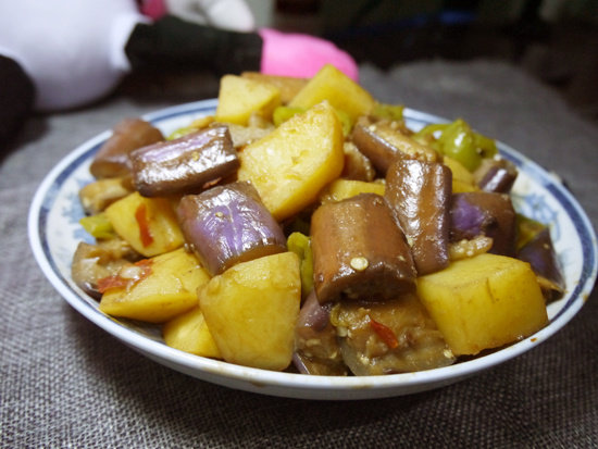 3:锅中多放些底油,放入土豆,煎至表面焦黄盛出备用,外放入茄子翻炒变软盛出备用。