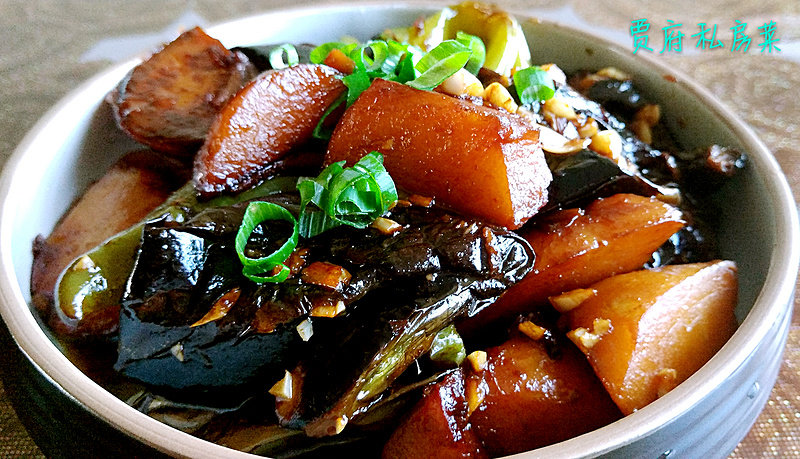 9:放入炸好的土豆和茄子块,翻炒片刻。
