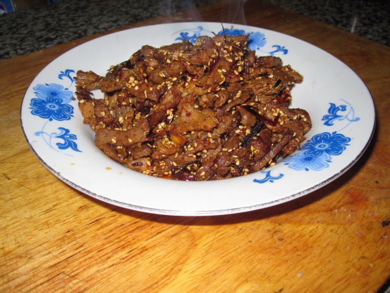 6:大约炒10-15分钟后,牛肉熟透就可以了,然后向牛肉中倒入芝麻,我不喜欢吃孜然,如果你喜欢孜然,可以使得菜品提味的!