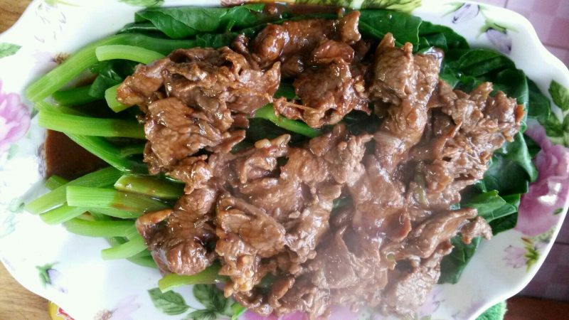 7:把牛肉和汤汁浇在芥兰上,一盘色香味俱全的芥兰牛柳就完成了!