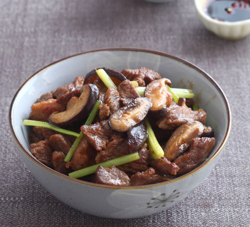 3:锅中烧热油,下入牛柳煸熟;然后下入香菇和芹菜段,加入蚝油炒匀即可。