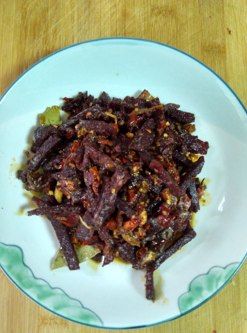2:锅里倒入平时炒菜一倍的菜油,油温7成热时倒入牛肉炸干;