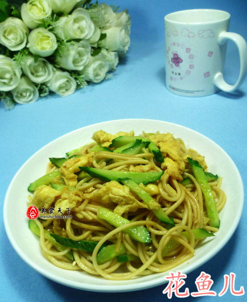 9:接着,合入过凉好的面条和切好的青瓜翻炒翻炒。
