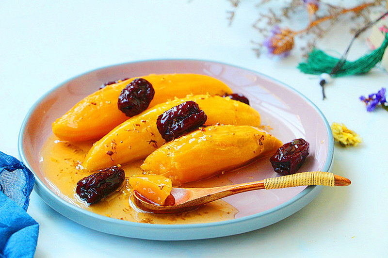 1:主料;红薯4个、红枣1把辅料:冰糖25克、桂花酱4茶匙、食盐少许。