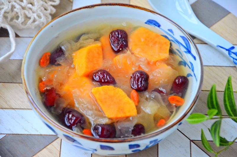 4:将泡发好的银耳放入锅中,放入五克黄冰糖,冰糖也可以不加,红枣和红薯本身就是甜的。