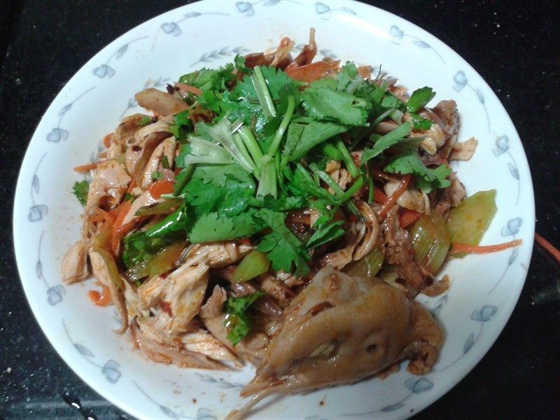 5:把冷冻后鸡从冰箱取出,用手撕成条块装。在鸡肉里放入焯过水的胡萝卜和芹菜、盐、鸡精、生抽、老干妈油辣椒、淋入香麻油,拌匀即可。撒上香菜出盘