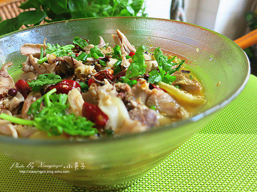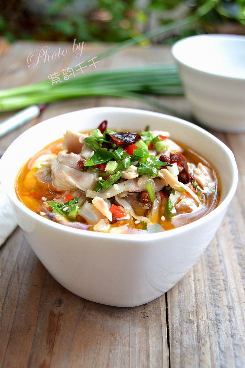 6:鸡凉了以后将鸡肉手撕好,放入鸡汤中,淋入椒麻调料。